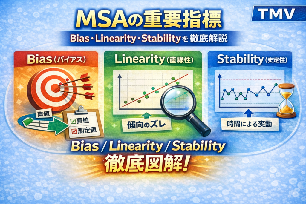 TMV(テスト メソッド バリデーション)MSAの重要指標(Bias・Linearity・Stability)を徹底解説 statlab_manager / 2026年3月20日 ① はじめに MSA(測定システム解析)