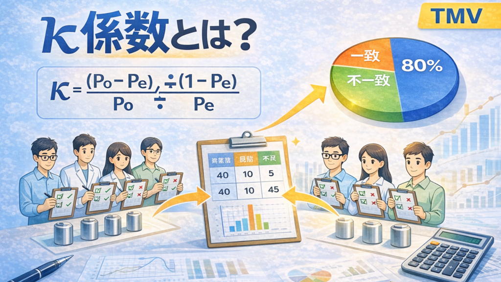 TMV(テスト メソッド バリデーション)κ係数とは?一致率との違い・計算方法・見方をわかりやすく解説 statlab_manager / 2026年3月28日 k係数(カッパ係数)とは、2つの測定結果