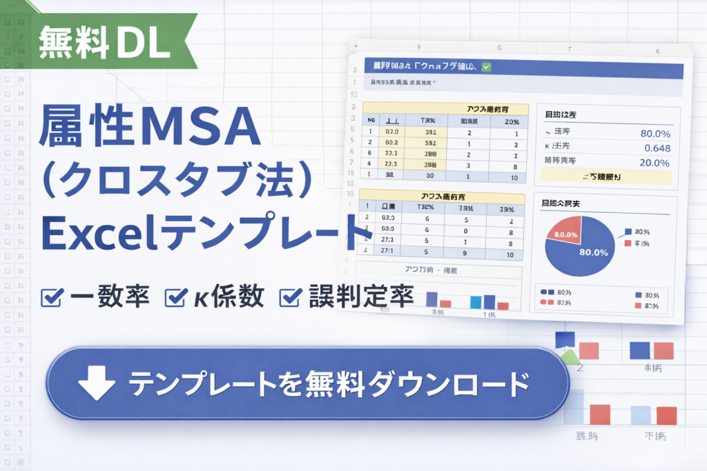 Excelで実践統計解析, TMV(テスト メソッド バリデーション)【無料DL】属性MSA(クロスタブ法)Excelテンプレート|一致率・κ係数・誤判定率を自動計算 statlab_manager / 2026年3月28日 属性データの測定システム評価(クロスタブ
