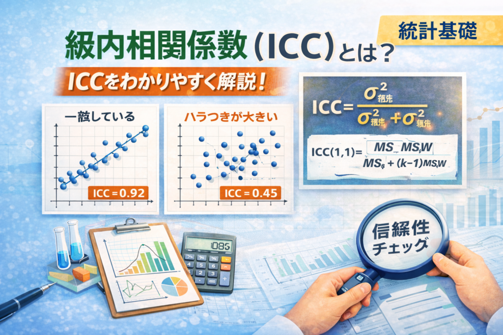 TMV(テスト メソッド バリデーション), 統計解析の基礎級内相関係数(ICC)とは?検者内・検者間の信頼性をわかりやすく解説! statlab_manager / 2026年3月28日 「同じ人が測っても、毎回結果が違う」「人