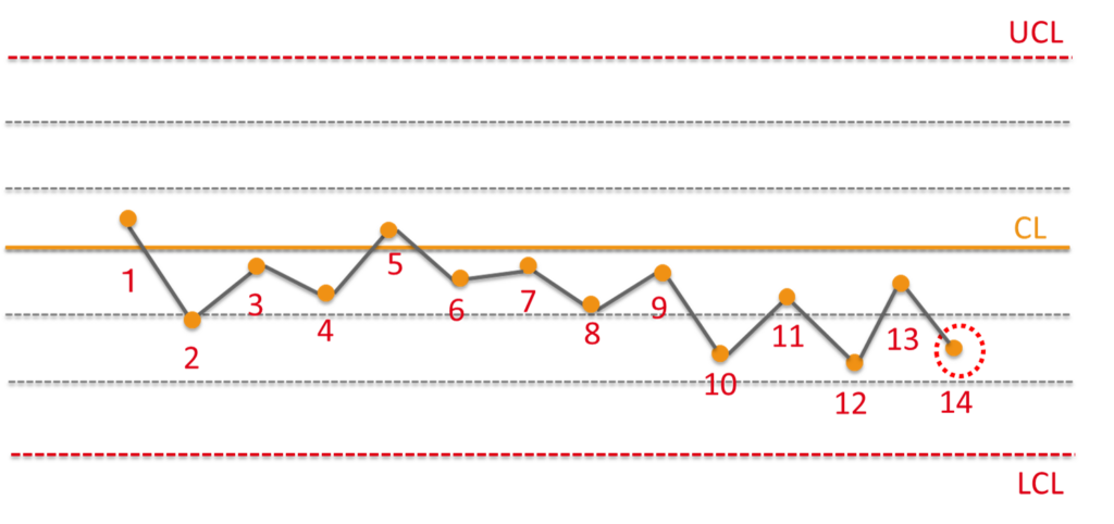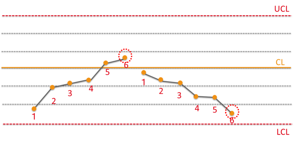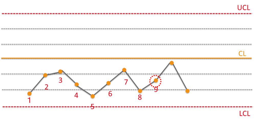 まだ3σの管理限界線は超えていなくても、かなり極端な値が続いている状態です。異常の初期段階として捉えることができます。