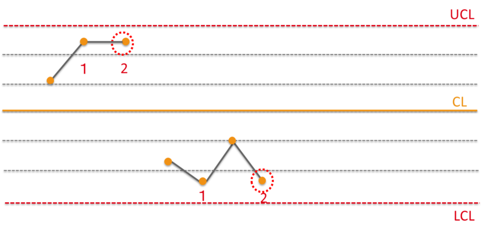 連続した3点のうち、2点以上がCLから2σ以上離れた位置にある場合です。