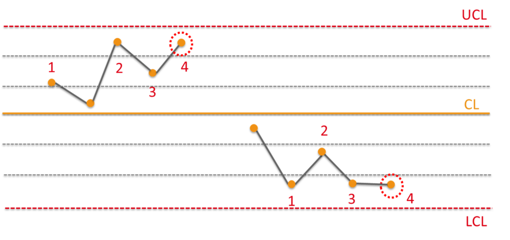 ルール6:連続する5点中、4点が1σ限界線を超えている
