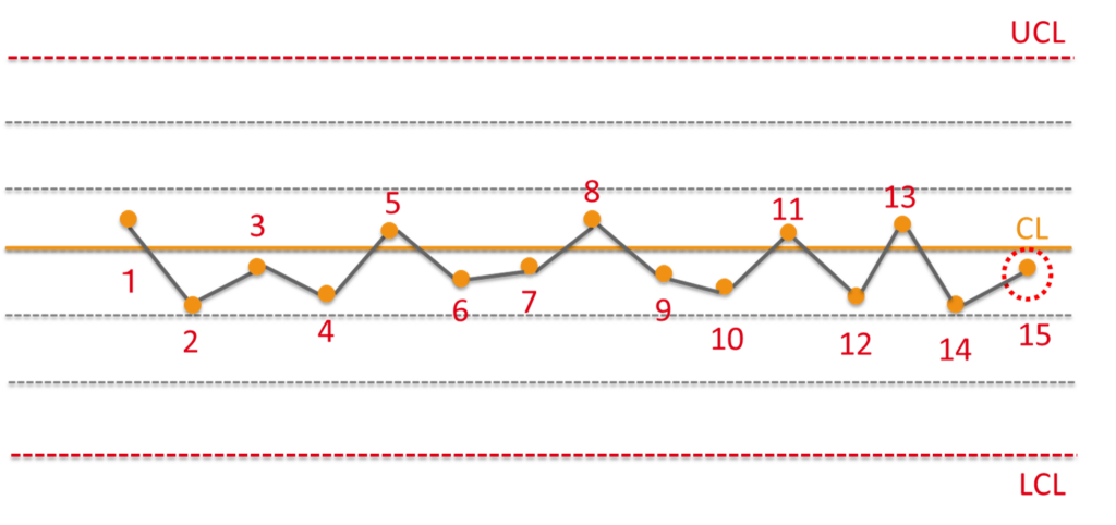 1点でもUCLまたはLCLを超えた場合は、異常原因によるばらつきが発生した可能性が高いと判断します。この場合は、設備異常や条件変更、作業ミスなどが起きていないか確認します。