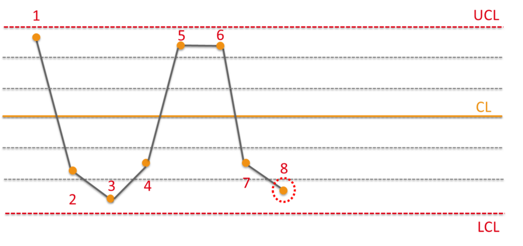 以下管理図の点の動きのパターンについて、8つの判定ルールを示します。