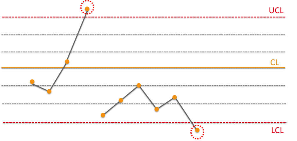 が引かれます。そして、点がUCLやLCLを超えた場合は、異常原因によるばらつきが発生したと判断します。