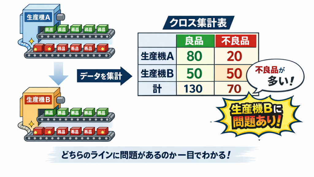 例えば、生産機AとBで良品・不良品をクロス集計した場合、