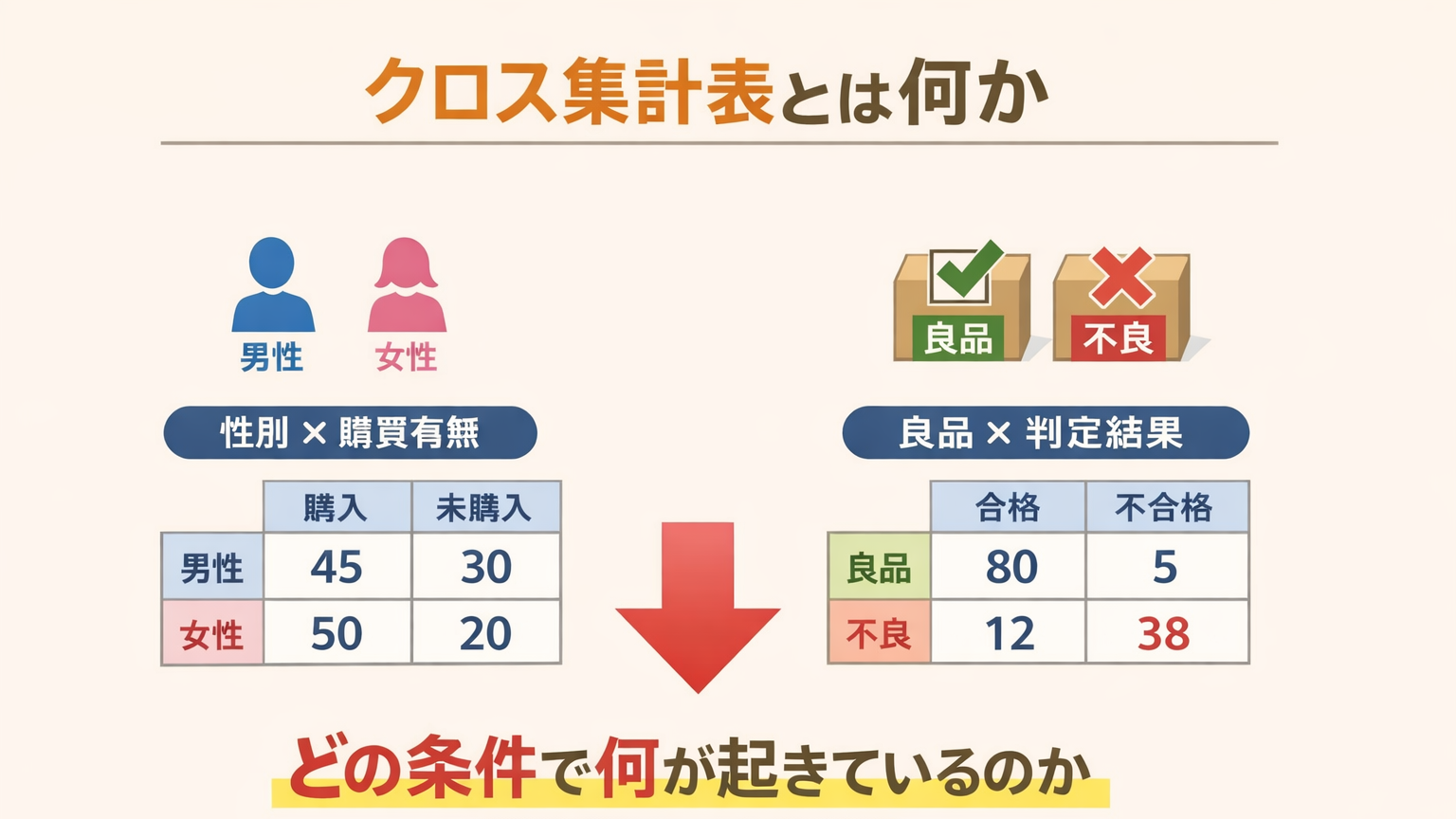 クロス集計表とは、2つのカテゴリデータの関係を整理し、