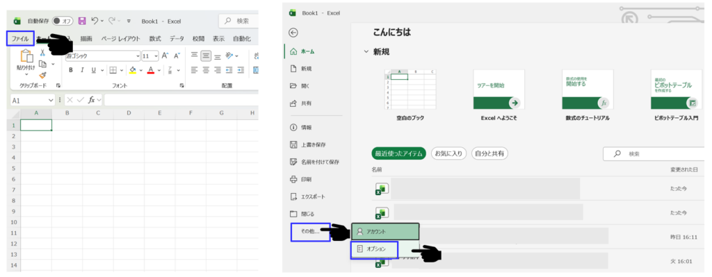 Excelを開き、メニューバーから「ファイル」→「その他」→「オプション」を選択します