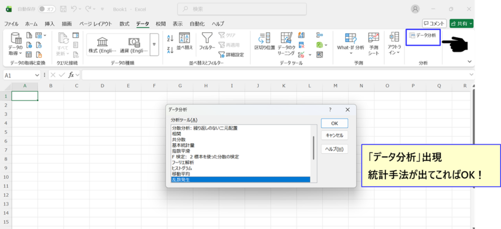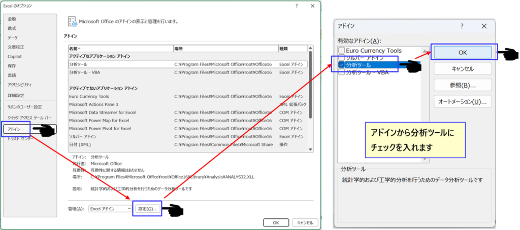 ・ダイアログボックスの「分析ツール」にレ点を打ちます
