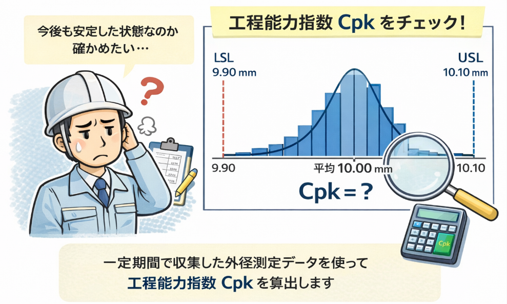 Cpkはあくまで「ある時点での工程能力」を示す指標です。そのため現場では、