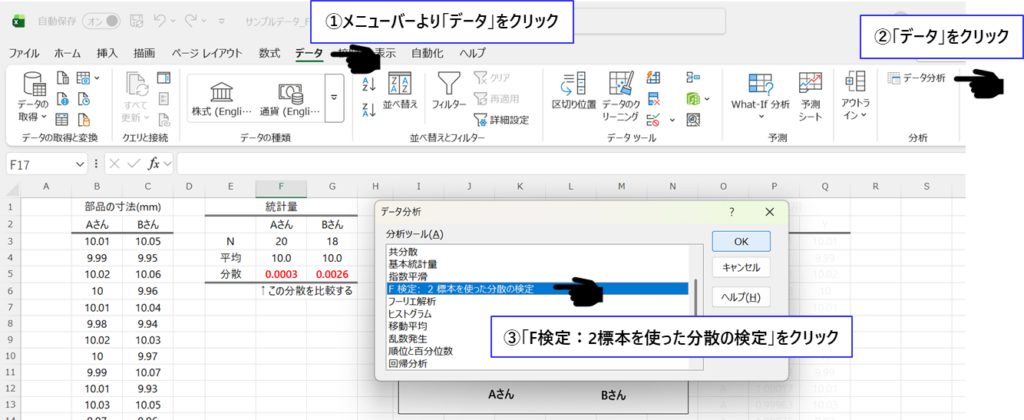 メニューバーより「データ」→「データ分析」→「F検定:2標本を使った分散の検定」