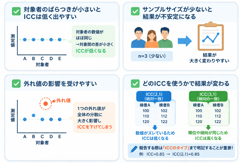 ICCは、単に「相関があるか」を見る指標ではありません。