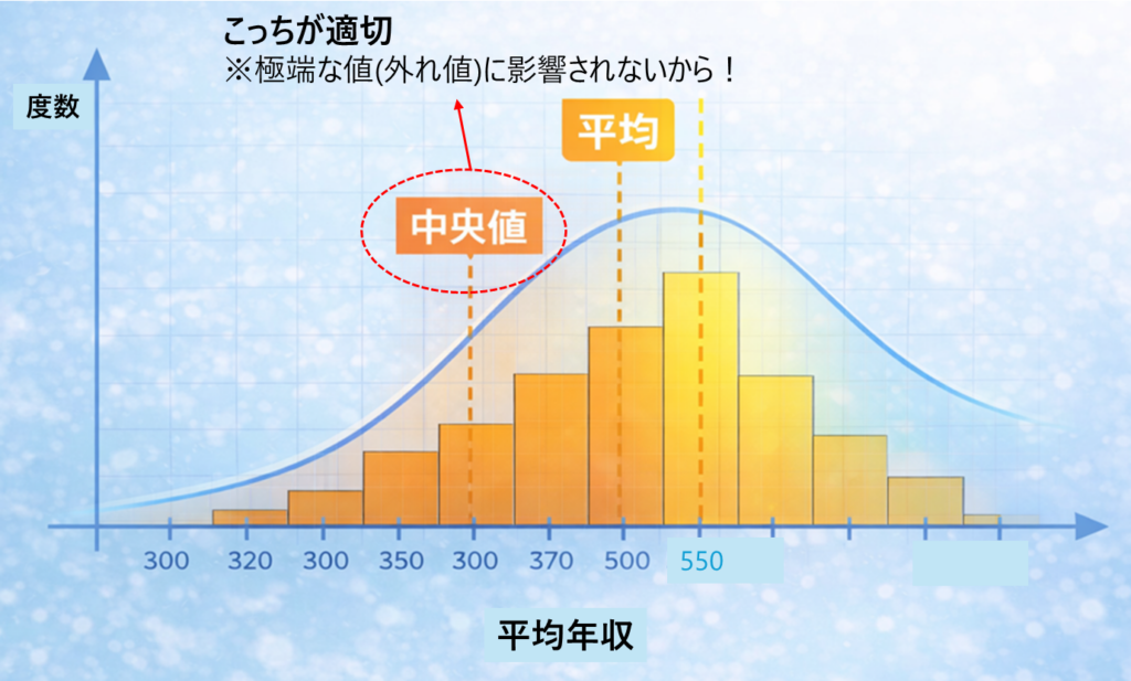 このように、データに極端な値が含まれる場合は、平均より中央値を使った方が実態を表しやすいことがあります。