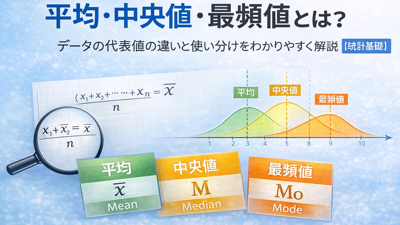 これらはすべて「データを代表する値」ですが、データの分布によって適切な代表値は異なります。