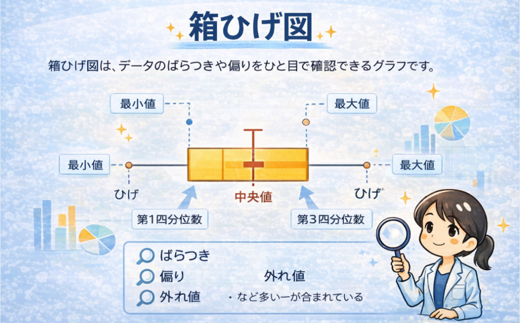 箱ひげ図では、この Q1〜Q3の範囲(IQR) が箱として表示されます。