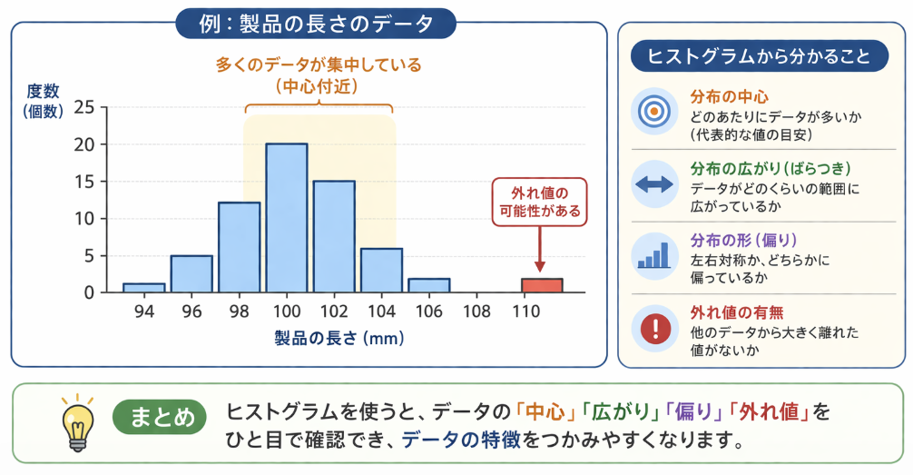 ヒストグラムは、「分布の中心」「分布の広がり」「分布の偏り」「外れ値の有無」をひと目で把握できるため、統計では非常によく使われるグラフです。
