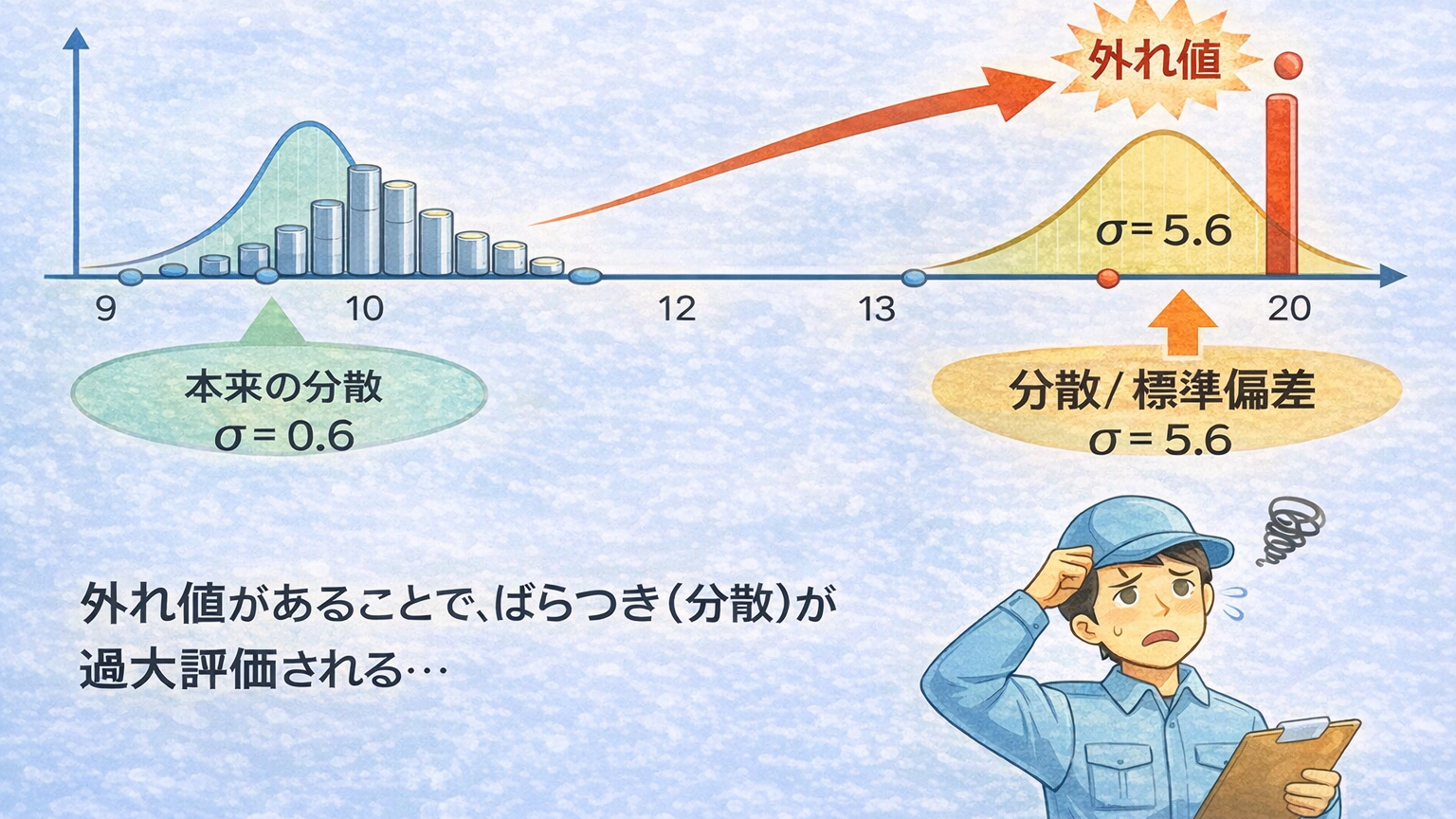 このとき、バラツキ(分散/標準偏差)の計算において、外れ値は必ず大きくなる方に寄与する点に注意が必要です。
