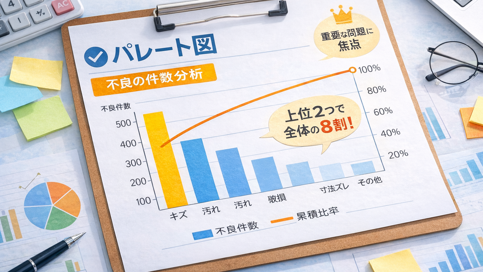 棒グラフを大きい順に並べ、さらに累積比率を重ねて表示することで、全体の中でどの項目の影響が大きいかを把握しやすくします。不良の種類別件数、クレーム内容別件数、停止原因別の発生回数、不具合要因別の損失額などを整理するときに役立ちます。