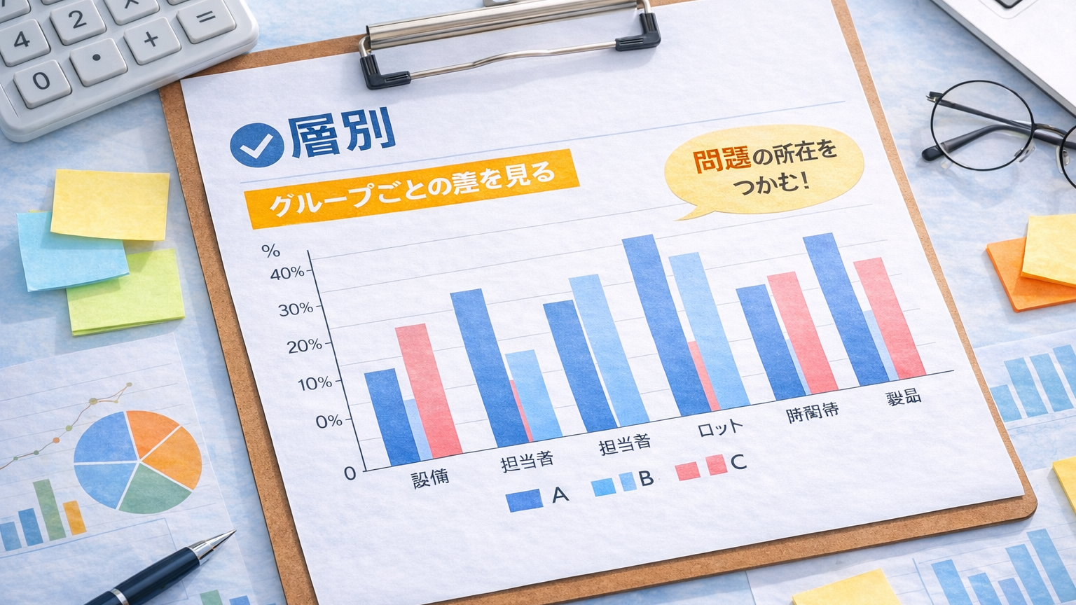 QC7つ道具の中では少し性格が異なり、単独のグラフというよりは、データの見方・分け方に近い道具です。設備別、担当者別、時間帯別、材料ロット別、製品種類別などに分けて見ることで、全体では見えなかった差が見えることがあります。
