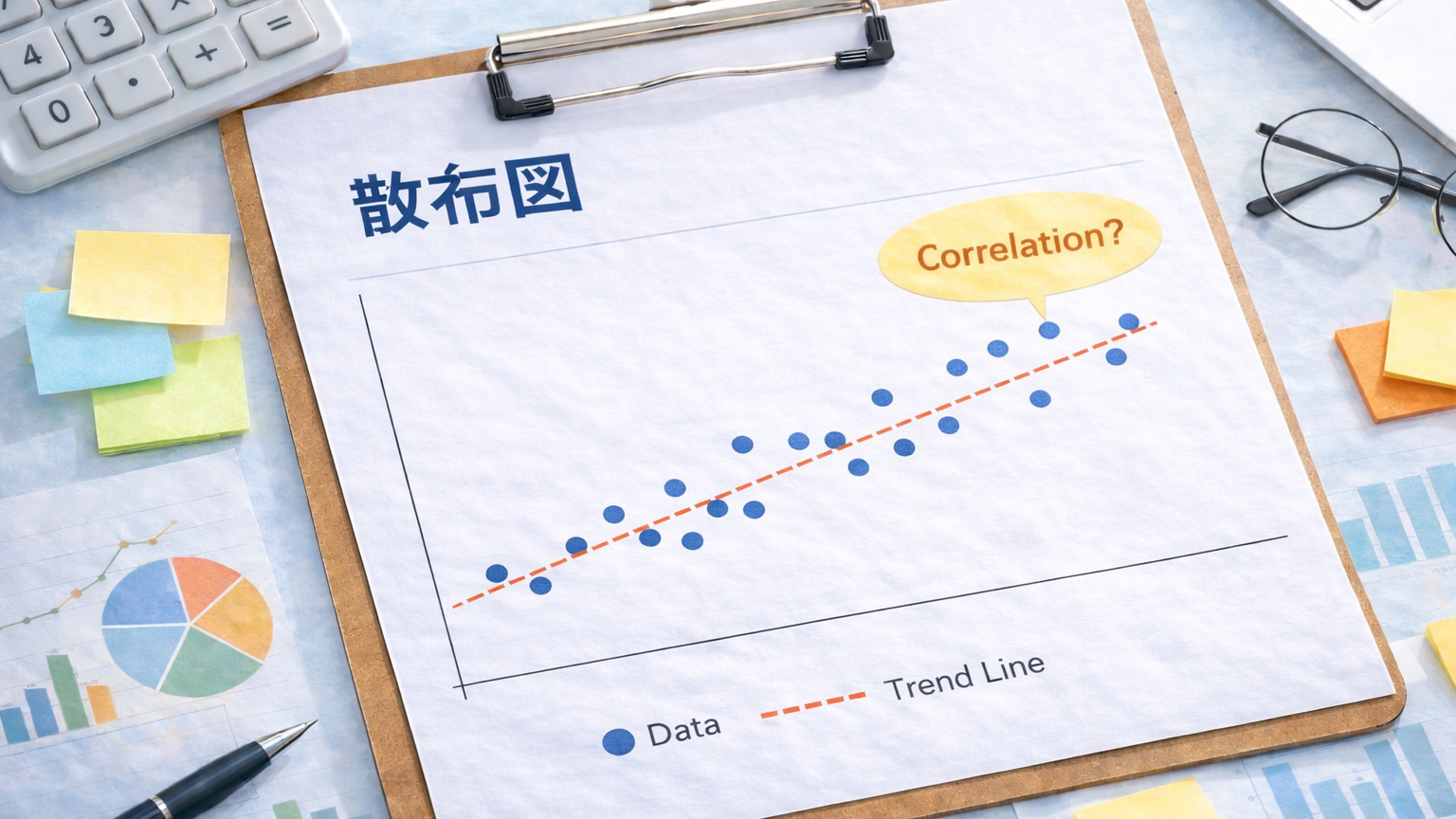 | 散布図 | 2つの変数の関係を見る | 温度と不良率など、2つの項目に関係がありそうか見たいとき | 関連の有無、正負の傾向、外れ値 |