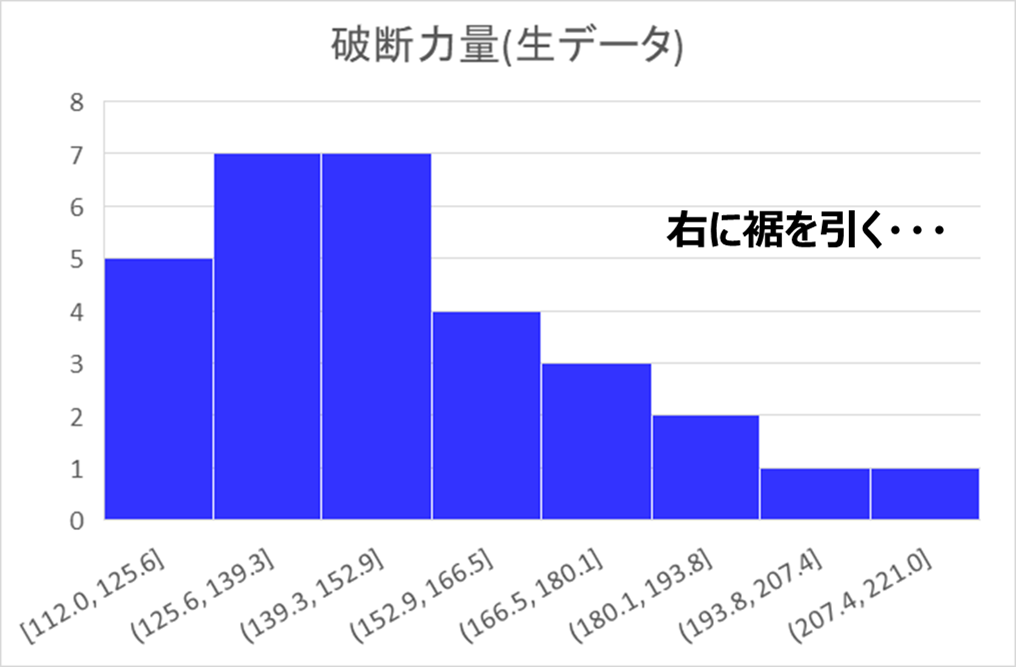 右に歪んだ分布では、大きな値が一部に存在するため、平均値や標準偏差が実態より大きく見積もられ、Cpkの値が不正確になることがあります。