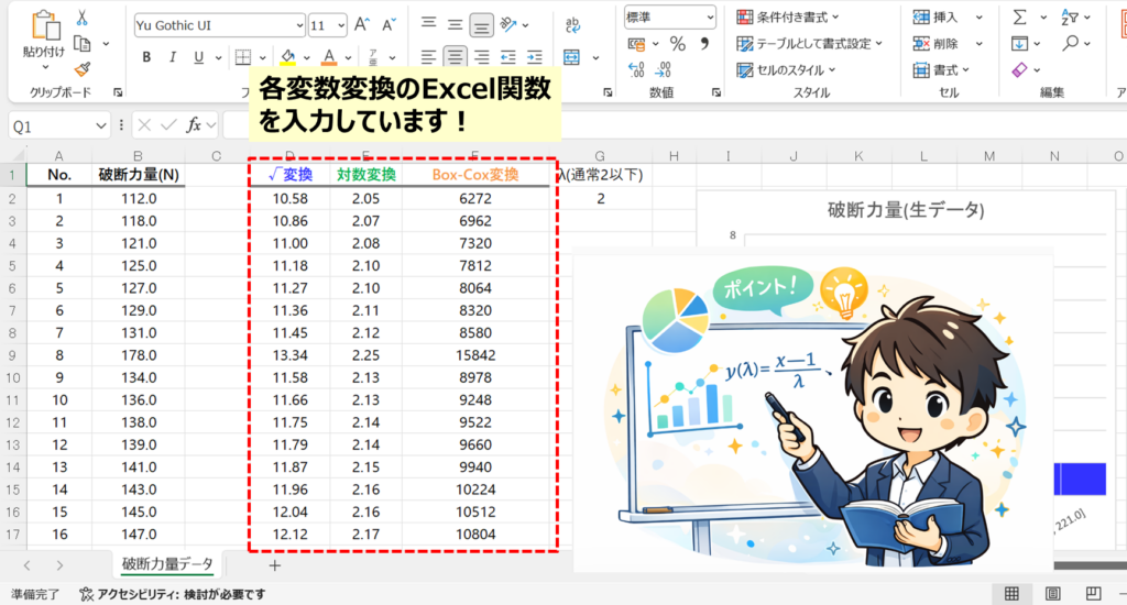 ただし、Excel単体ではボックスコックス変換を直接実施するのはやや難しく、MinitabやJMPなどの統計ソフトを使うことが一般的です。