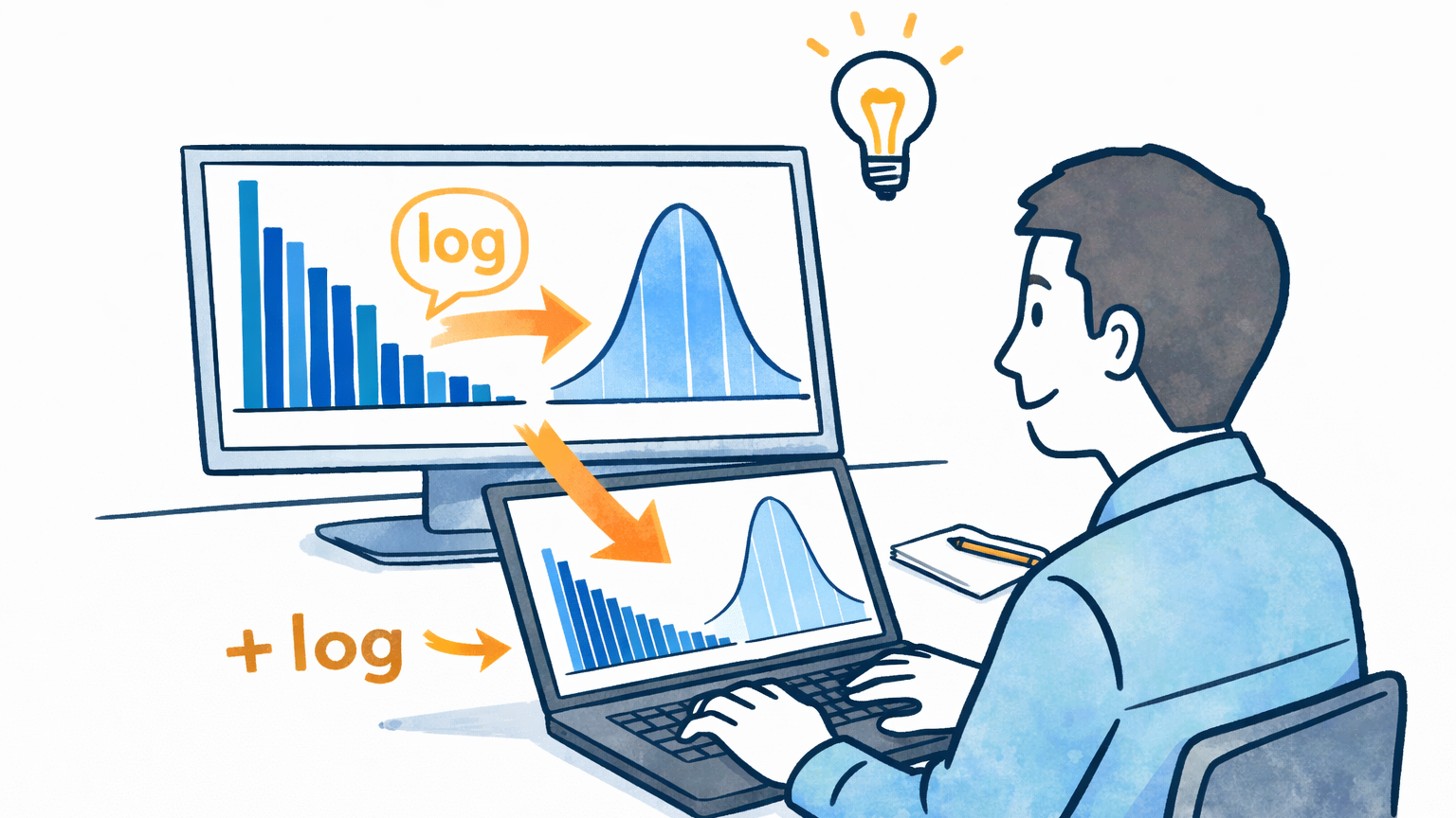 例えば、右に長い裾を持つデータに対して対数変換を行うと、極端に大きな値の影響を小さくでき、分布が正規分布に近づくことがあります。