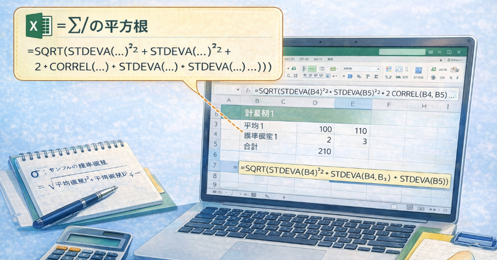 Excelでは、標準偏差を直接足し算せず、次のように入力します。