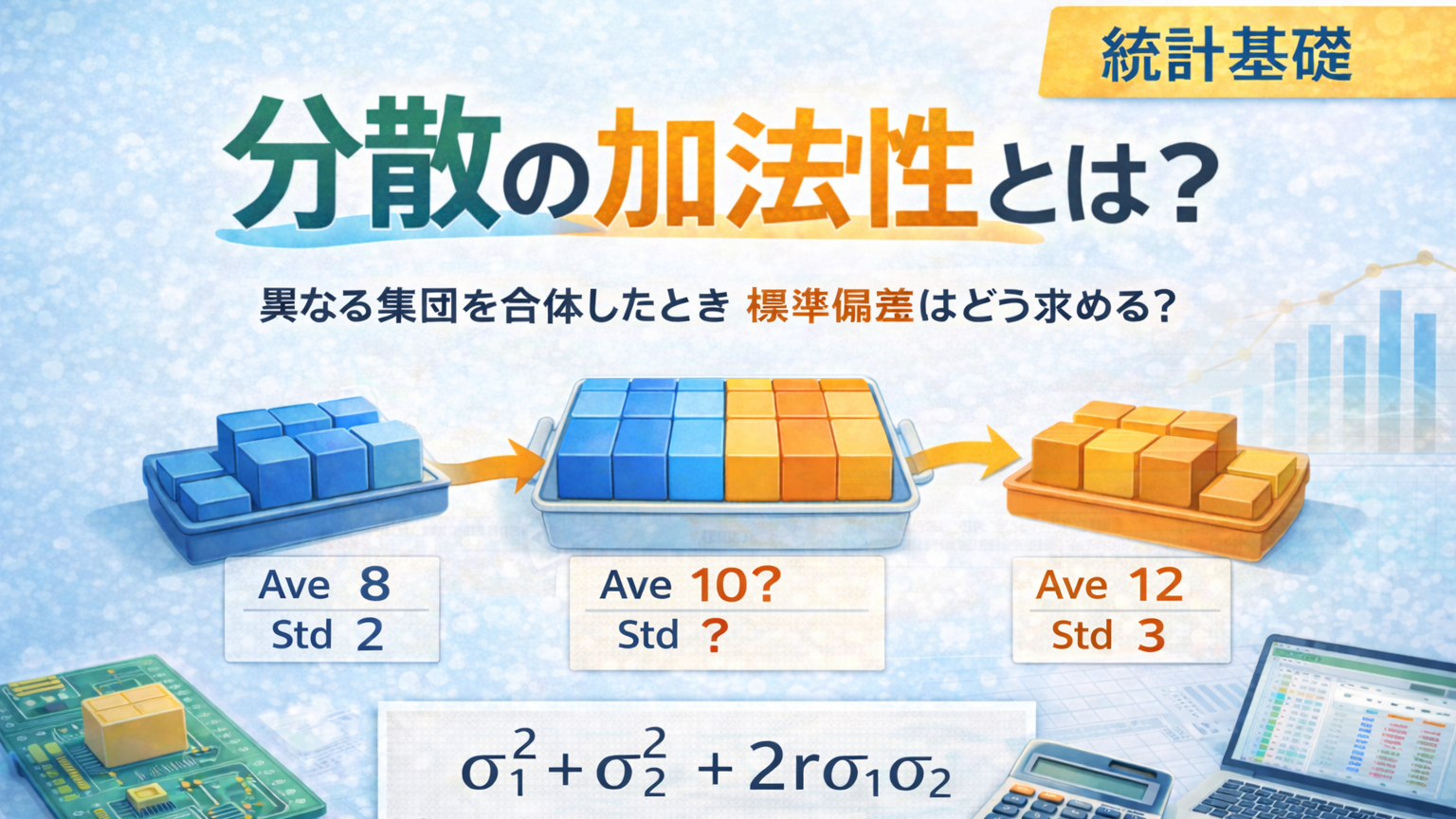分散の加法性とは、独立した2つのばらつきを合成するとき、標準偏差ではなく「分散」を足し合わせるという考え方です。